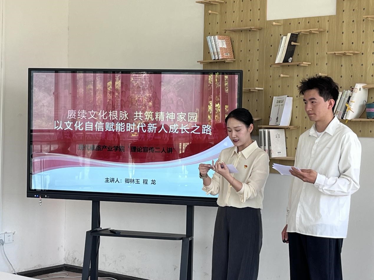 为深入学习贯彻习近平总书记在贵州考察时的重要讲话精神、 深入贯彻中央八项规定精神学习教育, 持续推动党的创新理论武装走深走实,根据学校相关工作要求,学院制定了系列 “理论宣传二人讲” 宣讲计划。近日,橘子直播 在“一站式”学生社区举办共青团“青年+”宣讲活动。本次宣讲由团委副书记卿林玉与青年学生宣讲团代表程龙搭档,以“二人对话”形式展开宣讲,围绕“增强文化自信、化风育人”主题,进一步弘扬中华优秀传统文化,坚定理想信念、增强文化自信。