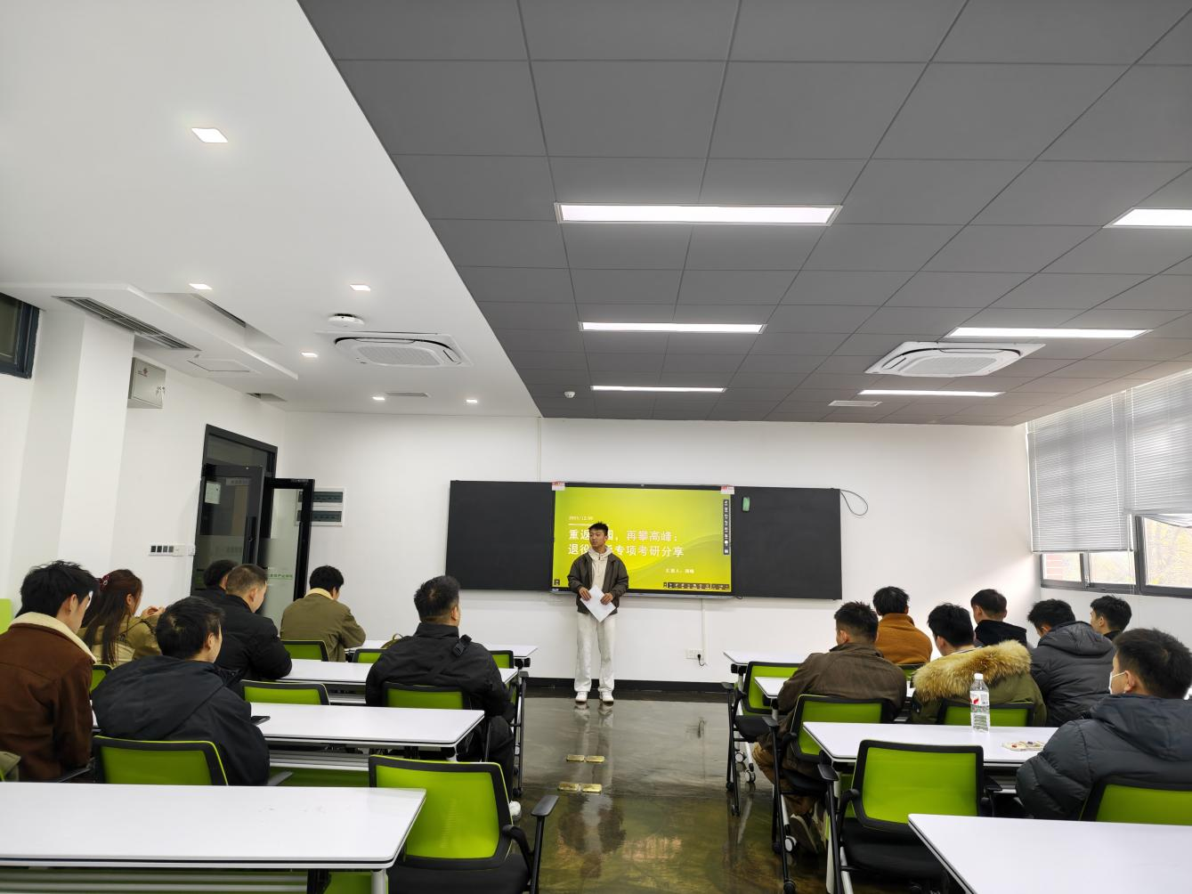 “从军营到校园,再到考研上岸,‘坚持’是我最想分享的关键词。” 分享会伊始,周峰结合自身经历,讲述了退役后重新适应校园学习、制定考研计划的过程。针对退役士兵最关心的 “考研专项计划”,他从政策解读、报考流程、优势分析三个维度展开:详细讲解了退役士兵专项计划的招生范围、分数线划定、名额分配等核心信息,对比普通考研与专项计划的报考差异,强调“专项计划竞争压力相对较小,但需提前关注目标院校招生简章,明确专业限制与报考条件”;同时分享了自己筛选院校时“先看专业实力、再查历年录取数据、最后联系在读学长”的实用方法,帮助同学们避开“信息差”陷阱。