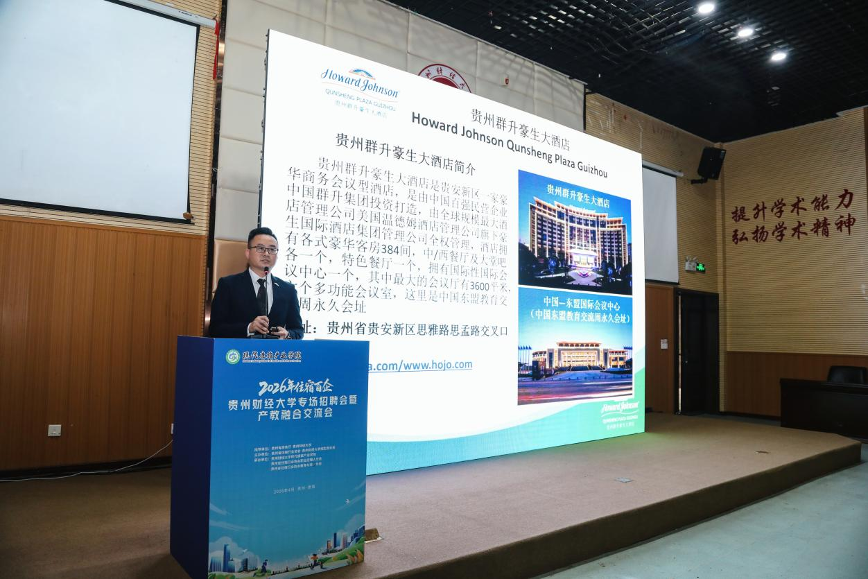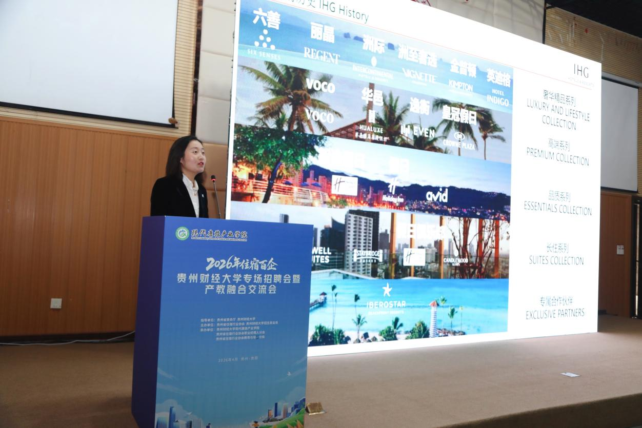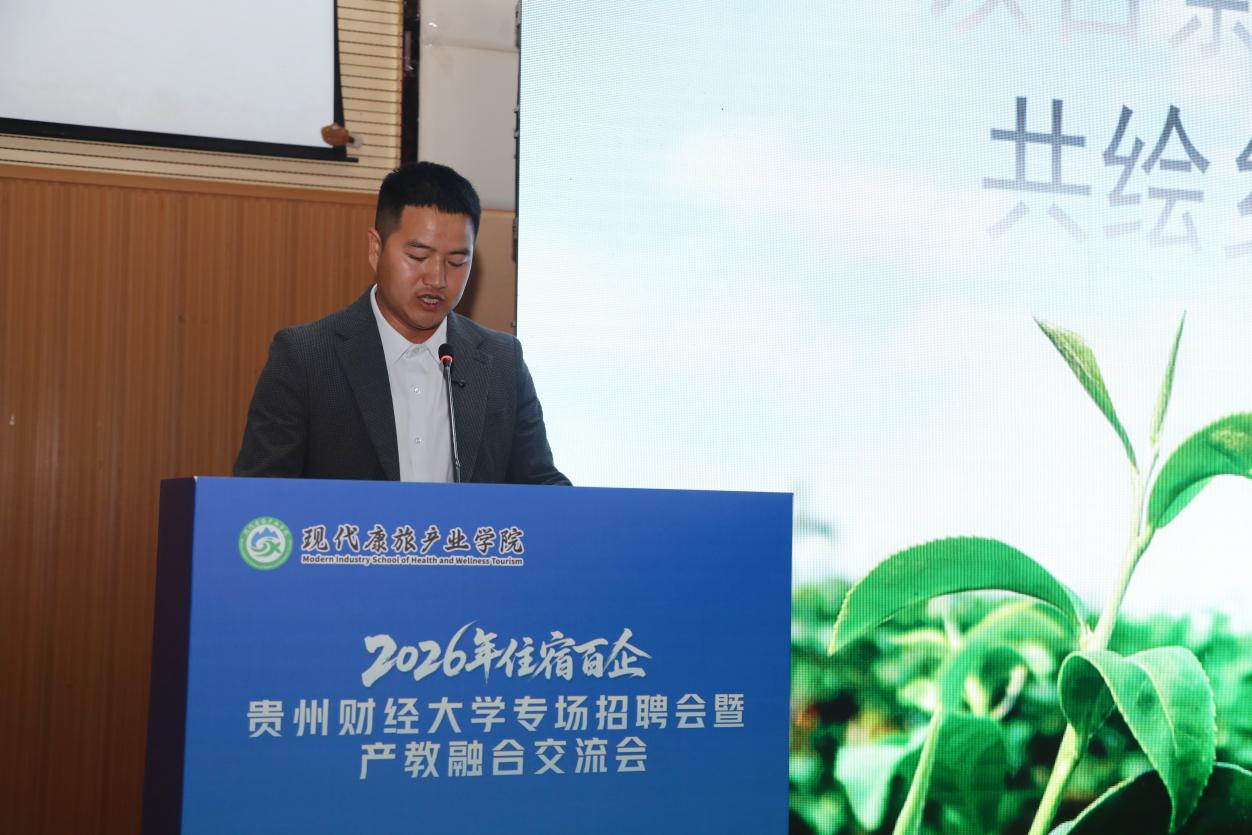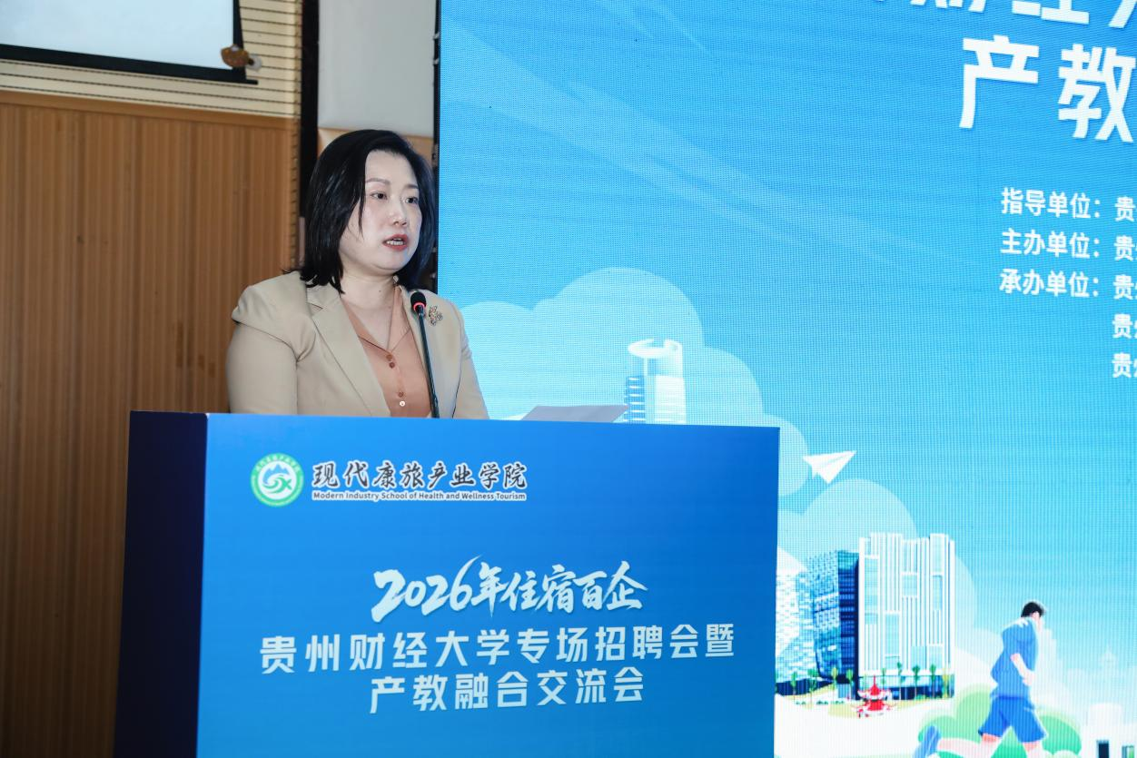 贵州省商务厅党组成员、副厅长朱霖毅同志随后致辞。她指出,住宿行业是贵州省文旅消费与服务业发展的重要支撑,当前行业正处于转型升级关键期,对专业人才需求迫切。此次活动搭建了校企对接的优质平台,既帮助企业精准吸纳后备力量,也推动教育链与产业链深度衔接,希望校企持续深化合作,为贵州省住宿行业高质量发展注入新鲜动能。